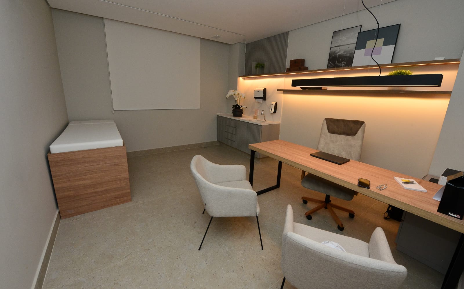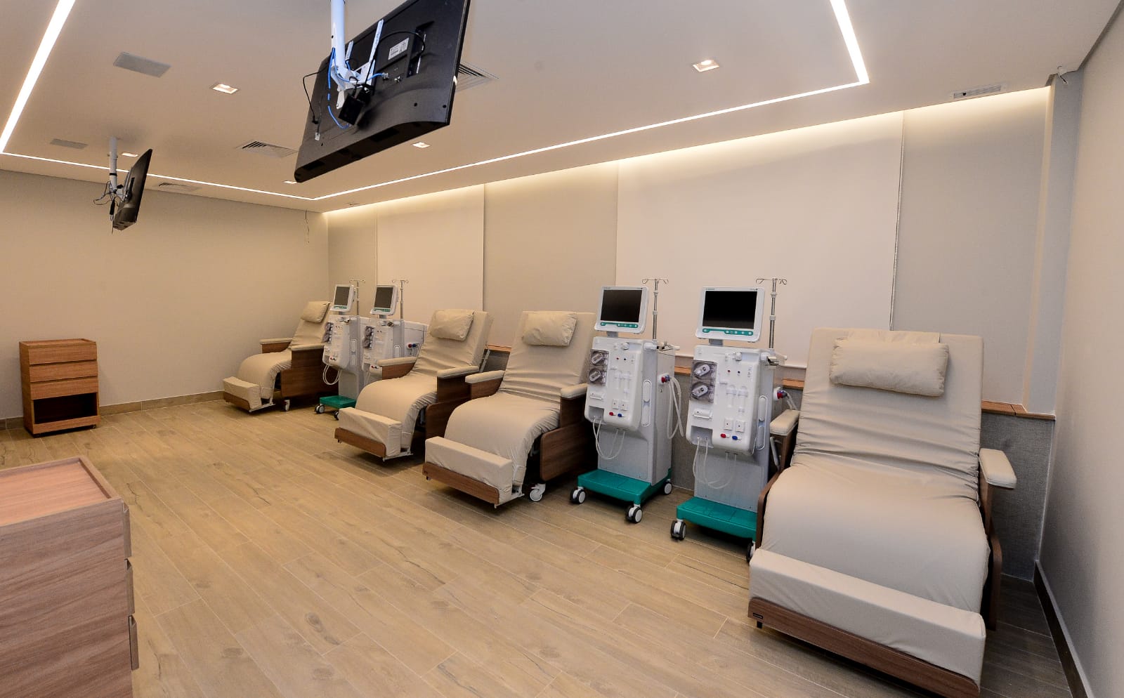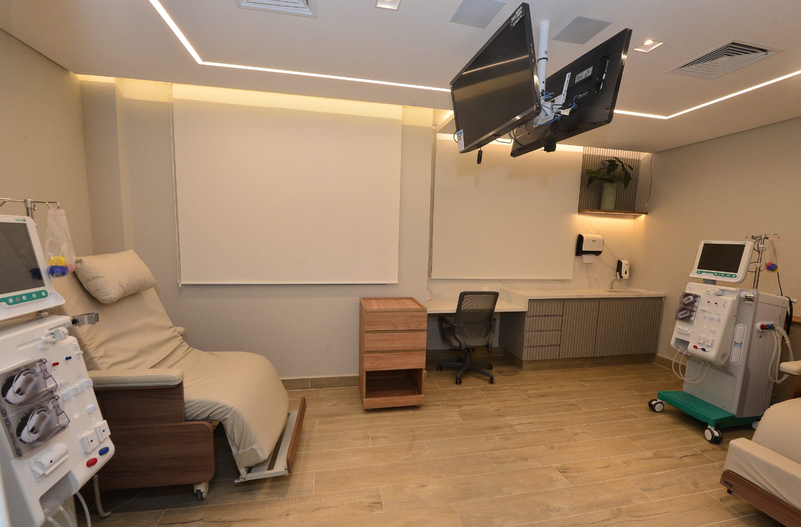 A clínica foi projetada para fornecer um ambiente acolhedor e reconfortante para pacientes e suas famílias, com uma área espaçosa de 800 metros quadrados e seis salas equipadas para tratamento de hemodiálise, bem como pontos de serviço.