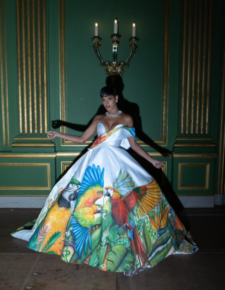 Inspirada na diversidade e na liberdade de ser, a coleção apresentou criações que exploraram uma rica paleta de cores e texturas. Um dos destaques foi o vestido com a pintura de uma ave silvestre, cuja arte no tecido foi assinada pelo artista plástico Selvo Afonso, agregando ainda mais originalidade e valor artístico à proposta.